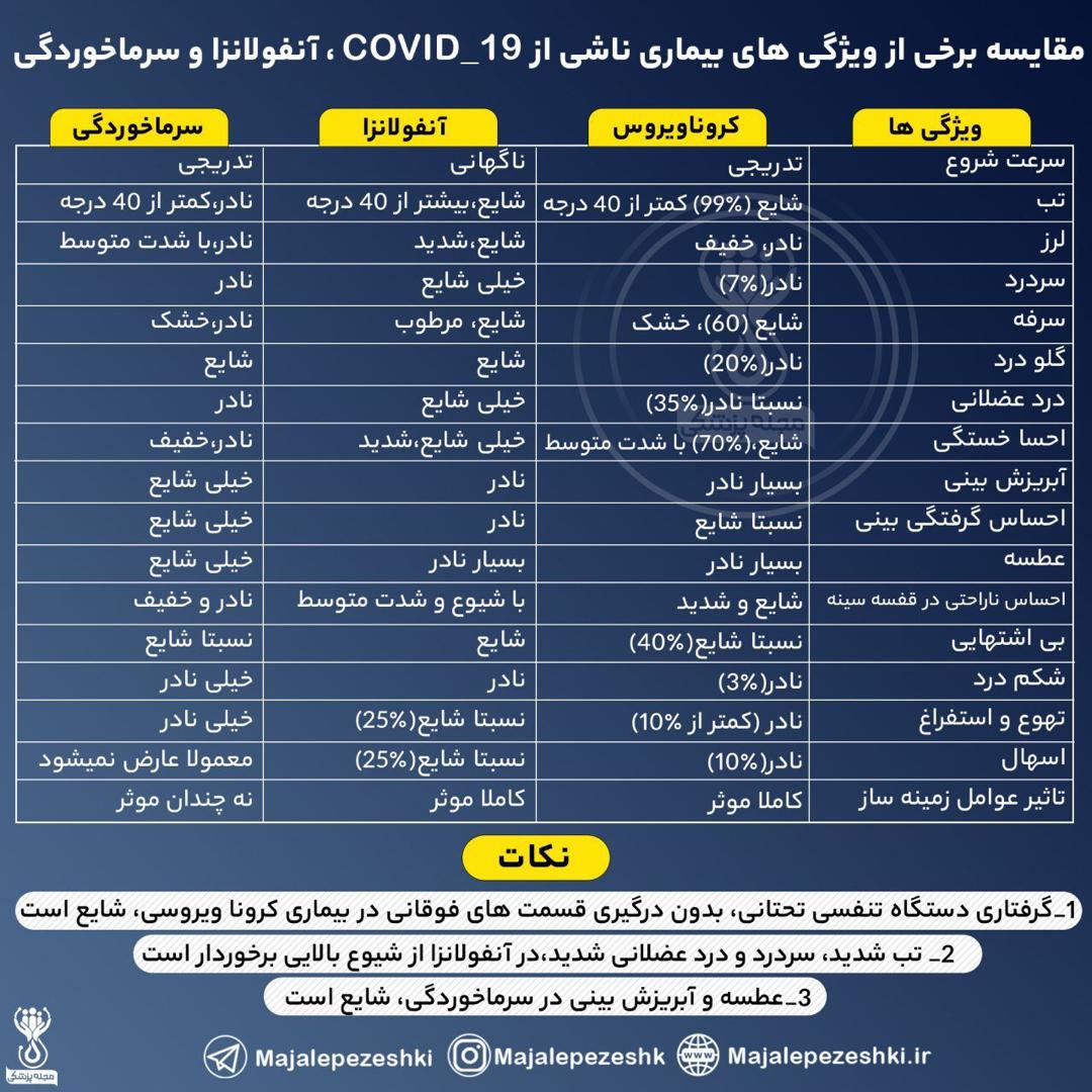 v مقایسه برخی از ویژگی های بیماری ناشی از covid -19 ، آنفولانزا و سرماخوردگی
